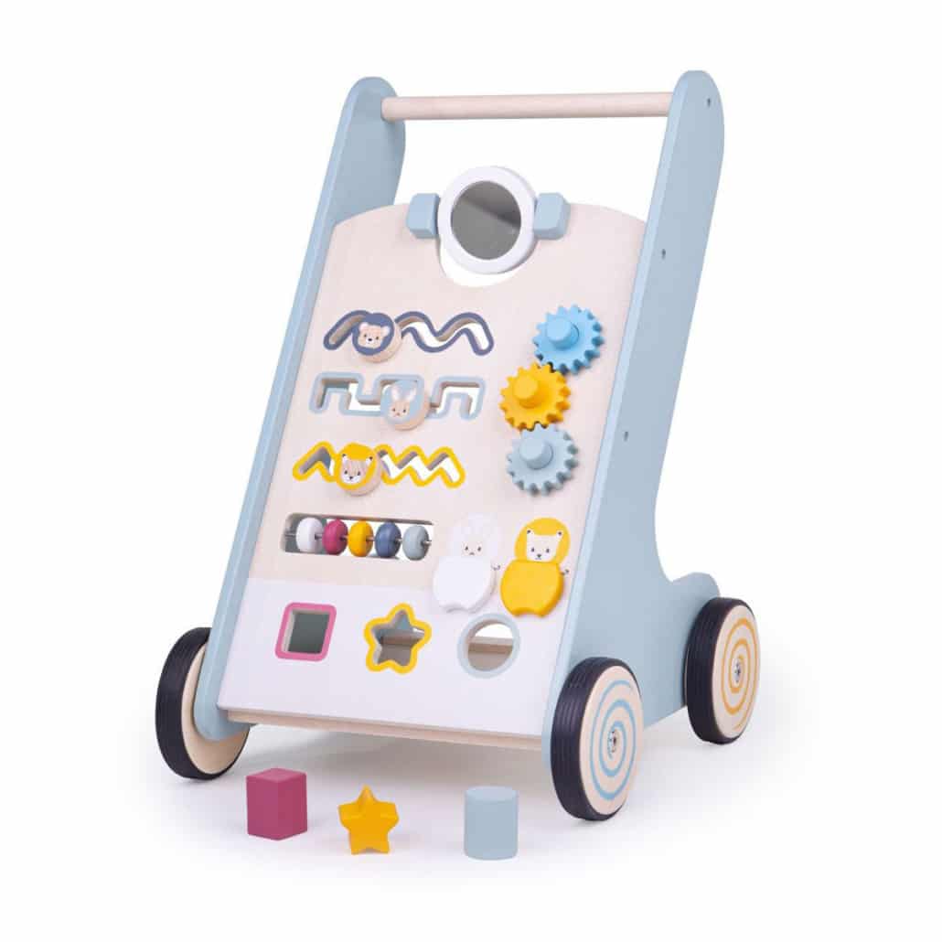 Houten speelgoed van Bigjigs toys vind je bij Kadomino. Deze houten activity walker is geschikt voor kinderen vanaf 1 jaar of wanneer ze kunnen lopen. Als kinderen nog niet kunnen lopen, kunnen ze heerlijk spelen met de verschillende activiteiten voor de kleine handjes. Zoals draaiende tandwielen, vormensorteerders, kralen die heen en weer te bewegen zijn en er is zelfs een opklapbaar spiegeltje. De kleuren zijn in pastel dus prettig bij het gebruik. De allerkleinsten kunnen oefenen achter de duwstang om zo de eerste stapjes te zetten. Gemaakt van veilig gebeitst hout. De hoogte van de duwstang is ongeveer 50 cm.