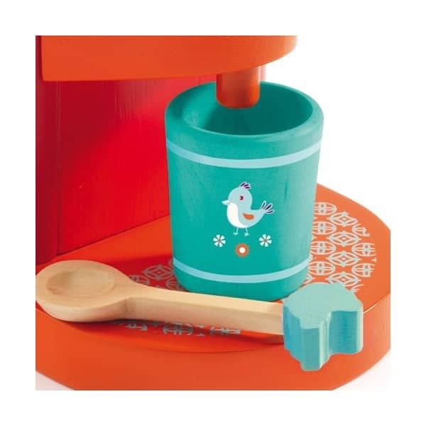 Djeco heeft prachtig keuken en picknickspeelgoed in haar assortiment. Net echt, dit houten koffiezet-apparaat Djeco. Gemaakt van prachtig hout in vrolijke kleuren blauw en rood. Inclusief kopjes en lepel. De hendel is heen en weer te bewegen. Bovenop het apparaat staan de kopjes. Leuk dat kinderen nu zelf een kopje koffie kunnen zetten zonder dat ze zich verbranden aan het hete water. Veilig materiaal zonder scherpe randen en kanten. Geschikt vanaf 3 jaar.