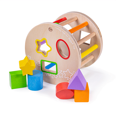 Houten speelgoed van Bigjigs toys vind je bij Kadomino. De houten vormenstoof Bigjigs of ook wel activity roller genoemd met veel mogelijkheden die kan staan en rollen. Inclusief zes gekleurde blokjes in verschillende vormen die er vanaf boven of zijkant ingestopt kunnen worden. Als je er mee rolt maakt deze een rinkelend geluid. Door één van de spaken makkelijk open te schuiven, kunnen de blokjes er weer uit. De houten vormenstoof is gemaakt van mooi gebeitst naturel hout en de blokjes hebben vrolijke kleuren. Alles is netjes en rond afgewerkt. Spelen maar!