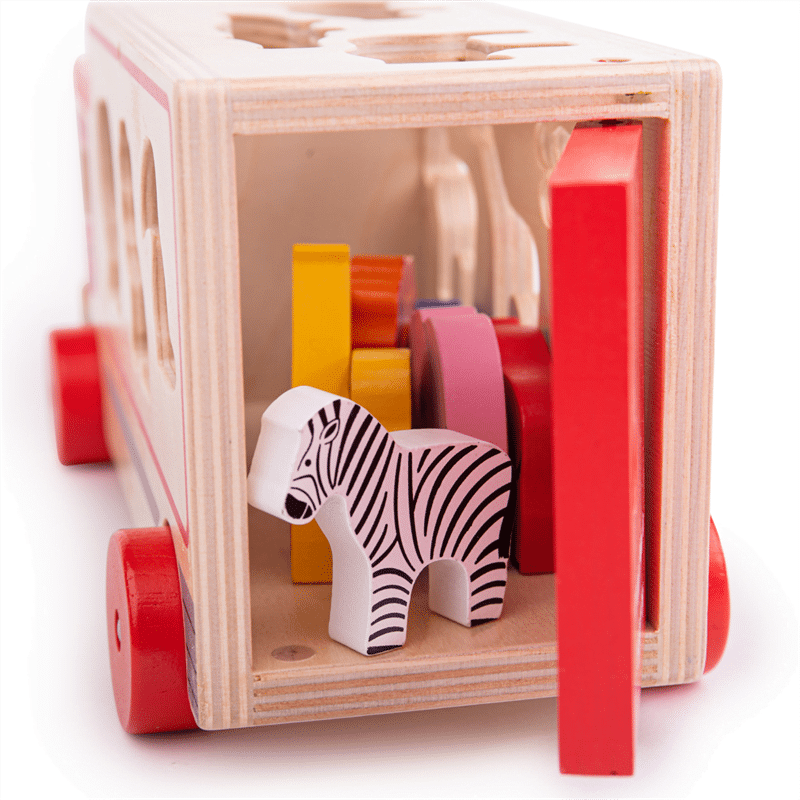 Het formaat van de vrachtwagen is 12,5 cm x 13 cm x 28 cm. Inclusief 9 gekleurde houten dierenfiguren in verschillende vormen. Geschikt voor kinderen vanaf 1 jaar. Het stimuleert de oog – hand coördinatie.