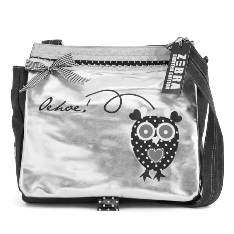 Kadomino verkoopt leuke en stoere rugzakken en tassen. Superleuke meidentas Zebra trends zilver. Het formaat is A4 en heeft de afmeting 30 cm x 35 cm. De tas sluit van binnen met een rits en de klep heeft nog een magnetische sluiting. Van binnen zitten er naast het grote vak nog verschillende kleine vakken. De kleuren zijn zilver, wit en zwart. Op de voorkant zit een afbeelding van een stoere uil. In hippe glimmende kleuren. Leuk voor mee naar school maar ook stoer om mee te shoppen. Geschikt voor kinderen vanaf 6 jaar.