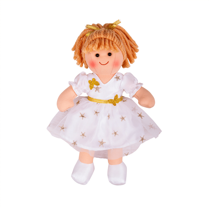 Deze meisjespop draagt de naam ‘Charlotte’ en heeft een prachtig satijn-achtig jurkje aan met gouden details, in de hoofdkleur wit. Haar lichtbruine haren zijn kort en ze heeft blosjes op haar wangen. De pop is 30 cm lang.