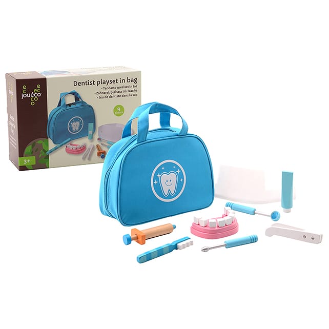 Verantwoord speelgoed vind je bij Kadomino. Dit tandarts speelset in tas bestaat uit 9 onderdelen en bevat een gebit, een tandenborstel en diverse instrumenten die de tandarts ook heeft. Kinderen leren alles over hun gebit en de tandarts met dit leuke tandarts speelset. Wanneer u uw kind met deze tandarts set laat spelen, vereenvoudigt dit zijn of haar bezoeken aan de echte tandarts.
